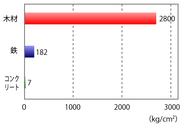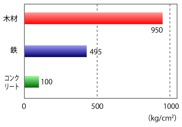 同じ重さで「木材」と他の材料を比較した場合、曲げ強度は鉄の約15倍、コンクリートの約400倍、圧縮強度で鉄の約2倍、コンクリートの約10倍、引っ張り強度は鉄の約4倍、コンクリートの200倍以上もあります。