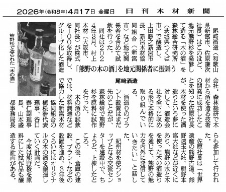 日刊木材新聞 掲載 「熊野の木の酒」を地元関係者に振舞う